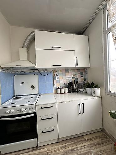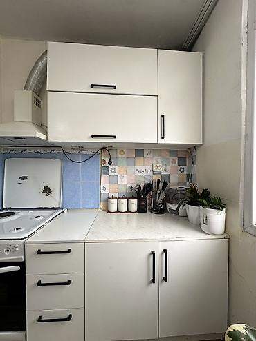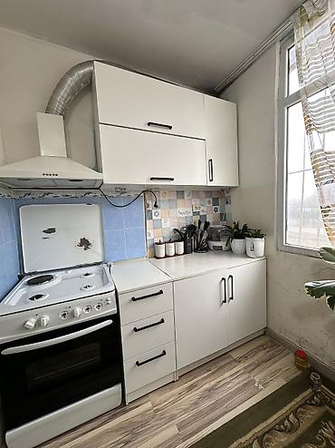 - Верхние шкафы: два горизонтальных шкафчика над плитой и один вертикальный навесной шкаф справа.