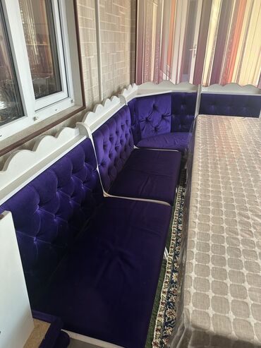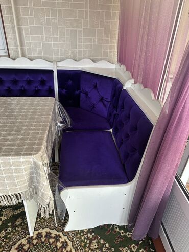 - Комплектация: угловой мягкий диван с высоким фигурным белым каркасом и стегаными фиолетовыми подушками, обеденный стол прямоугольной формы.