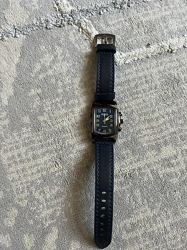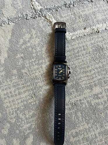 Кварцевые наручные часы с прямоугольным корпусом и синим циферблатом.