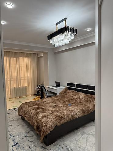 - Спальня с двуспальной кроватью, мягким покрывалом, рабочей зоной (стол + стул) и эффектной прямоугольной люстрой с хрустальными подвесами.