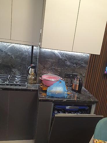- Кухня: гарнитур до потолка, фасады без ручек, столешница и фартук под тёмный камень, подсветка рабочей зоны. Встроенная техника: газовая варочная панель, духовой шкаф и СВЧ Midea в колонне, посудомоечная машина, мойка с измельчителем/сливом, розетки над столешницей, чайник.
