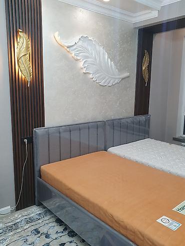 - Спальня: двуспальная кровать с мягким изголовьем, две отдельные матрасные основы, декоративная подсветка у изголовья, прикроватные панели.