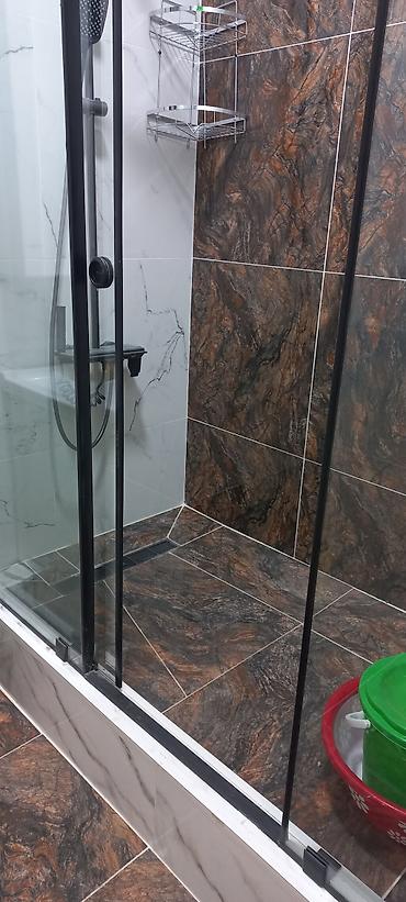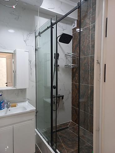 - Санузел: душевая зона в нише с раздвижными стеклянными дверями на черном профиле; тропический душ и ручная лейка; линейный трап; стены и поддон облицованы крупноформатной плиткой — сочетание белого «мрамора» и темного камня; угловые металлические полки; умывальник с тумбой и зеркальным шкафом; электрический водонагреватель; вытяжка.