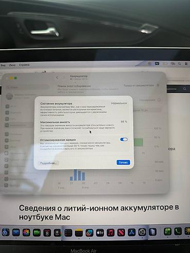 - Состояние аккумулятора по системе: «Нормальное», максимальная ёмкость 88%. Включена функция «Оптимизированная зарядка».