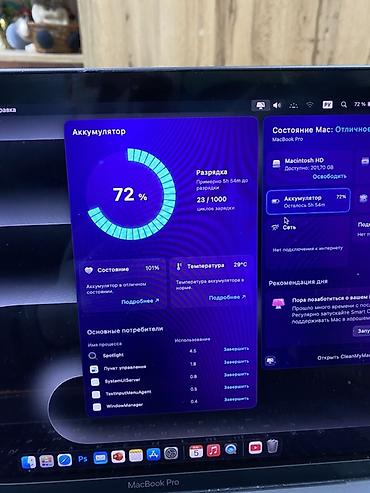 - Батарея: 23 цикла, ориентировочно ~5–6 часов работы при 72% заряда (по приложению на скриншоте)