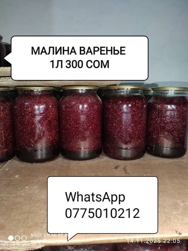 Малиновое варенье «Свой огород» из малины Кыргызстана. Соотношение малины и сахара 1:1. Вода не добавляется. Объем канистры — 5 л. Цена: 1200 сом. Бишкек: бесплатная доставка по городу.