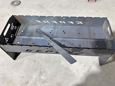 Разборный мангал из листовой стали с вырезанными логотипами авто - Материал: толстый листовой металл (сталь), лазерная резка. - Конструкция модульная: боковины, дно и полки соединяются без сварки,...