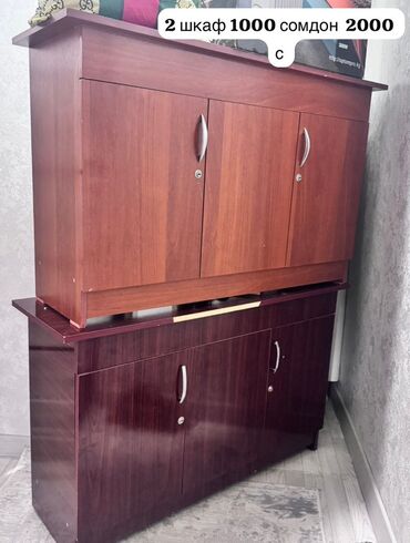 - Два низких шкафа с распашными дверцами и замками. Удобны для офиса или дома для хранения документов, посуды, текстиля. Металлические ручки, компактная глубина. На фото видно два шкафа: за оба указана цена 2000 с (подпись на изображении: «2 шкаф 1000 сомдон 2000 с»).