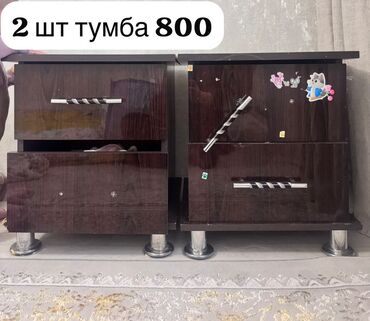 - Две прикроватные тумбы на хромированных ножках. По два выдвижных ящика с длинными декоративными ручками. Цена за 2 шт — 800 (указано на фото).