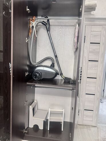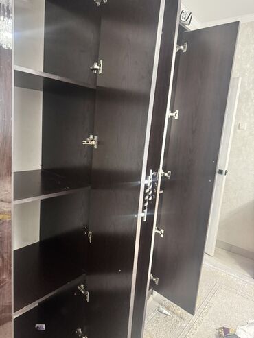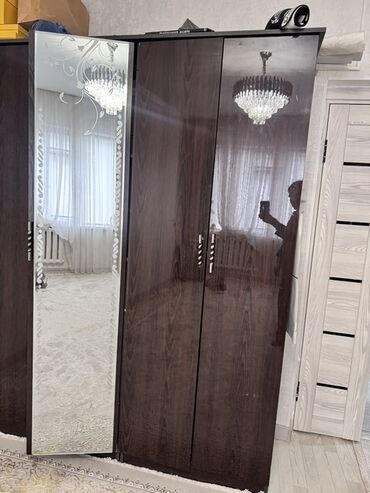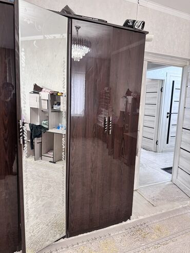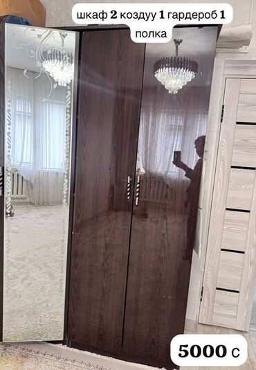 - Трёхсекционный шкаф-купе/гардероб тёмного цвета с высокой глянцевой дверцей и зеркальной створкой с матовым узором. Подпись на фото: «шкаф 2 коздуу 1 гардероб 1 полка — 5000 с». Подходит для спальни или прихожей: отделение под одежду на вешалках, полка для сложенных вещей, большое зеркало для полного роста.