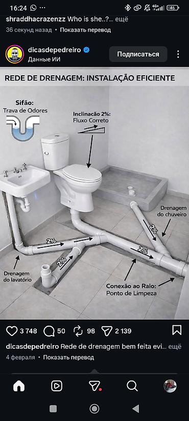 - Сантехника: монтаж и замена унитаза, раковины, сифонов, смесителей, душевой трапы; прокладка и разводка труб, организация уклонов 2% для корректного стока, подключение к ревизии/сливу, устранение протечек и засоров.