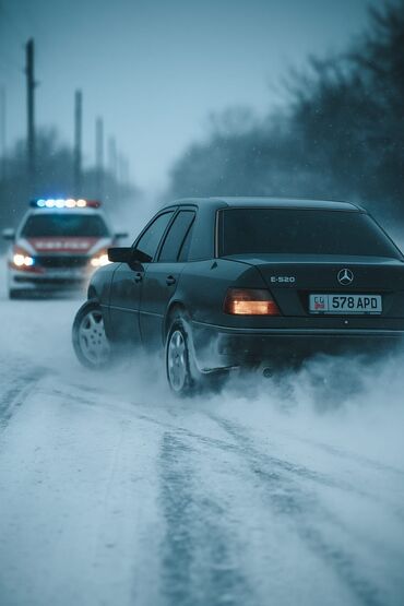 Mercedes-Benz E-Class W124 седан, темно‑серый, на киргизских номерах (KG). На задней крышке — обозначение E230. Кузов с классическим дизайном 90‑х, 4 двери.