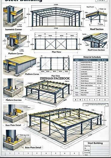 - Материаловедение (по спецификации чертежа): балки H300, швеллеры/уголки/С-профили различных сечений, крепёж М10 и шайбы, кровельные доборные элементы.
