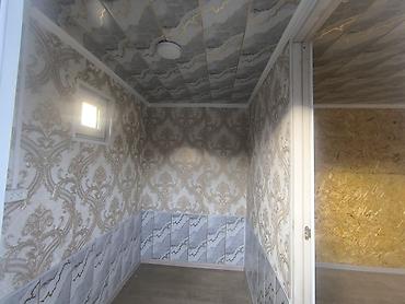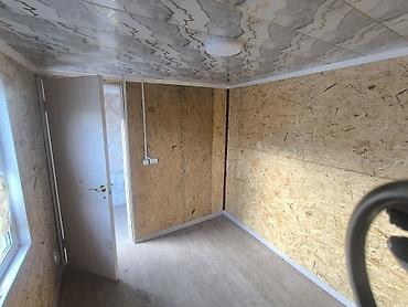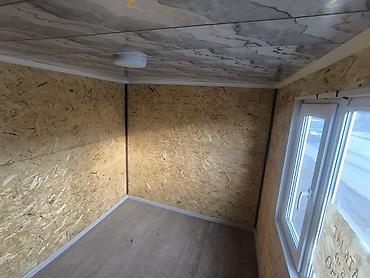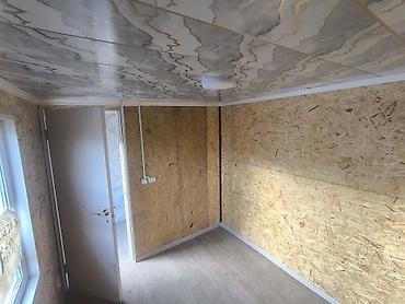 - Отделка стен: комбинированные панели с узором и под мрамор; часть помещения — листы OSB под дальнейшую отделку/склад