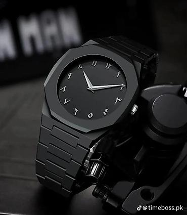 - Чёрный матовый циферблат без меток, вместо цифр — арабские индийские символы.