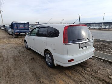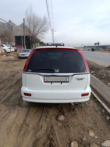 Honda Stream — компактвэн/минивэн 5-7 мест (на фото версия с задней шильдой Stream). Кузов белый, 5 дверей, задняя дверь — вертикальная с большой площадью остекления и спойлером. Тонированные задние стекла, рейлинга нет. Легкосплавные диски, штатные колпаки/диски 15". Задний стеклоочиститель, выхлопная труба справа, повторители поворота в передних фарах.