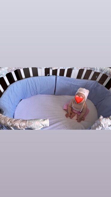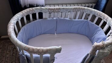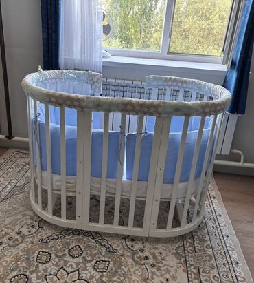 Модель на колесиках для удобства перемещения по комнате. В комплекте с кроваткой идут бортики и матрас, обеспечивающие комфорт и безопасность малыша. В хорошем состоянии