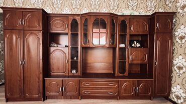 Классическая модульная стенка для гостиной из ламинированного ДСП под тёмное дерево.