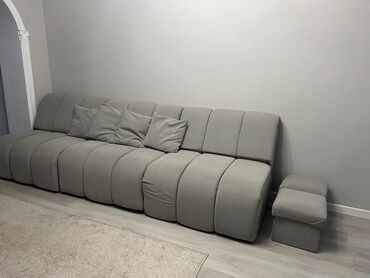 C подушкамиМодульный диван светлого оттенка, позволяющий создавать различные конфигурации в зависимости от потребностей и планировки помещения. Каждый модуль имеет вертикальную прострочку, придающую дивану современный вид. В комплект входят декоративные подушки, обеспечивающие дополнительный комфорт. Идеально подходит для просторных гостиных и студий, где важна гибкость расстановки мебели.