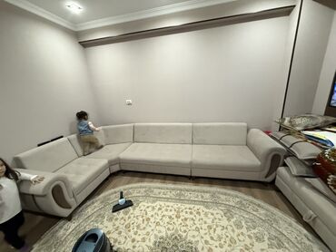 Угловой модульный диван с пуфом, б/у, пользовались 3-4 года - Конфигурация: длинная прямая секция + оттоманка (угол справа на фото) + отдельный большой пуф на роликовых опорах. - Посадочных мест: ...
