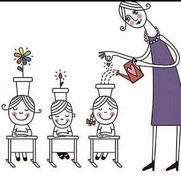 - Сюжет 1: учительница «поливает» детей заботой и знаниями — на головах «расцветают» цветок и свеча, символы развития и воодушевления.