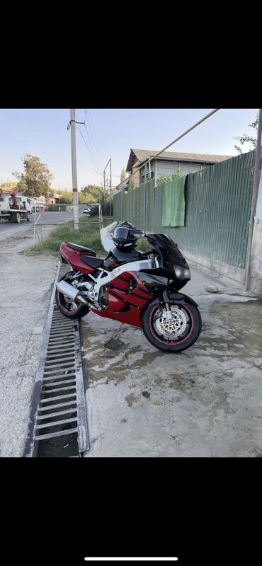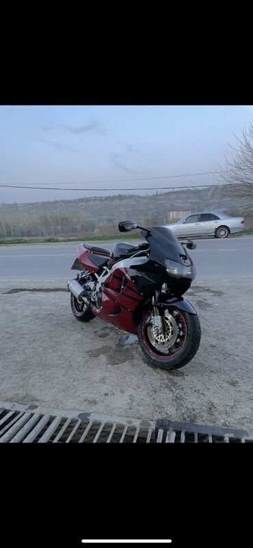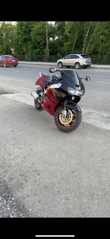 Спортбайк с полностью обвесным кузовом, цвет — чёрный с бордовыми элементами и серебристой рамой.