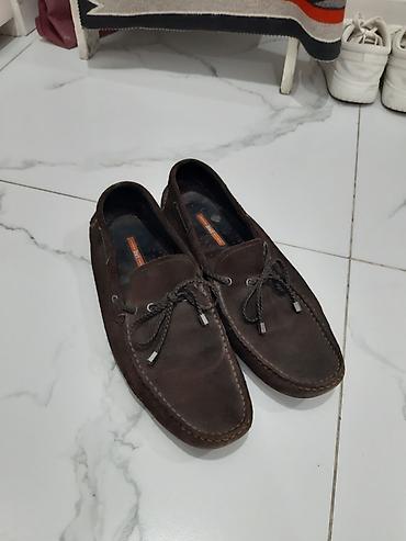 - Лоферы/мокасины: тёмно‑коричневые, замша, шнурки‑декор с металлическими наконечниками, прошитая кромка по периметру, мягкая стелька. Универсальный повседневный стиль.