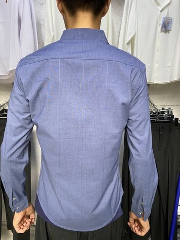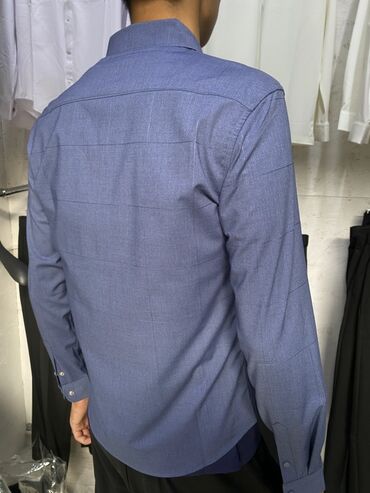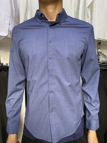 Мужская рубашка светло-голубого цвета с длинными рукавами. Модель прямого кроя, что обеспечивает комфортную посадку. Рубашка оснащена черными пуговицами по всей длине, что создает стильный контраст...