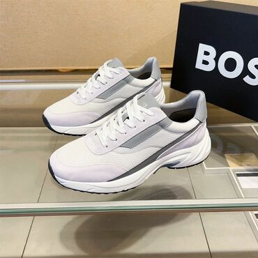 - Детали дизайна: контрастная белая промежуточная подошва, плавные панели, фирменные вставки и тиснение BOSS