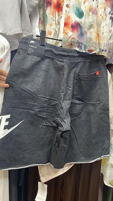 Шорты Nike свободного кроя серого цвета с белым логотипом. Эластичный пояс на шнурке обеспечивает комфортную посадку. Спереди расположены два боковых кармана для удобства. Модель выполнена из мягкой ткани, что делает ее идеальной для повседневного использования и занятий спортом. Края штанин без подшивки, что придает изделию непринужденный вид. На задней стороне расположен один накладной карман с небольшим красным ярлыком.