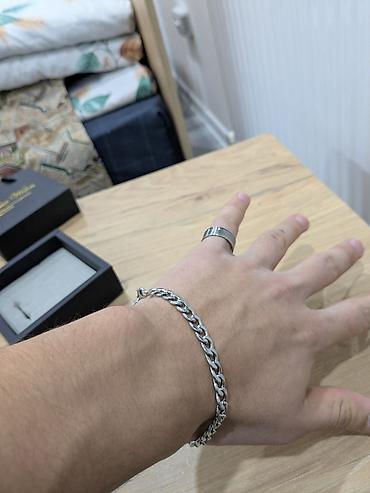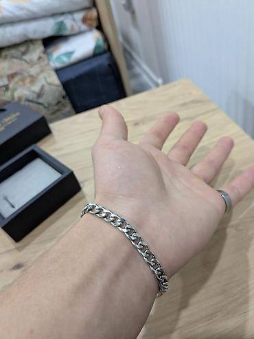 - Браслет-цепь из металла серебристого цвета с классической плотной плетёнкой (тип «крутая/якорная»), надежный карабин-застёжка.
