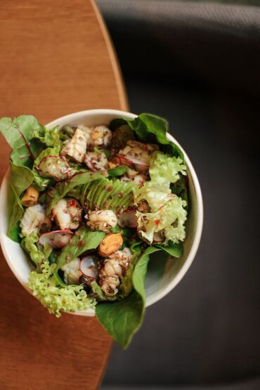 - Боулы и салаты с морепродуктами: микс зелени, авокадо, редис, кальмар, мидии и креветки; заправка с легкой цитрусово-соево-кунжутной нотой.