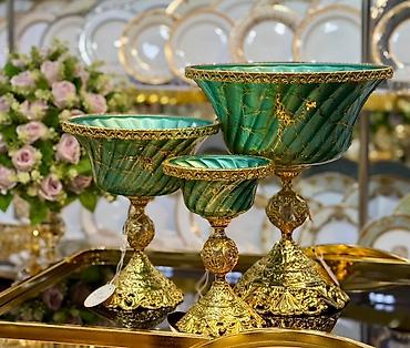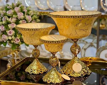 - Материал: литая металлическая основа с богатым золотистым орнаментом и резьбой; чаши из гладкого стекла/керамики с мраморным эффектом и золотыми прожилками.