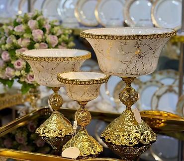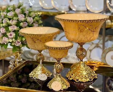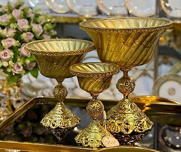 - Формат: комплект из трех чаш разного размера на изящных высоких подставках.