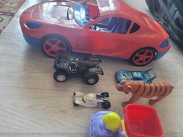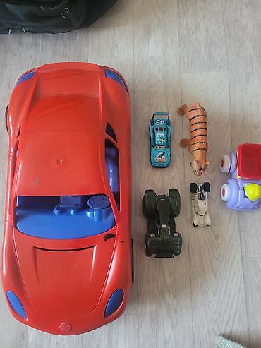 - Большой пластиковый спортивный автомобиль: красный кузов, синие элементы салона, крупные колёса.