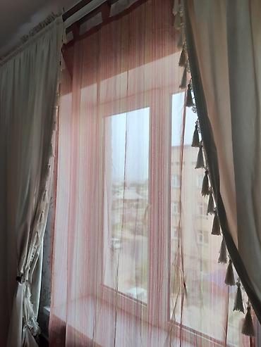 - Легкая полупрозрачная тюль в нежно‑розовых вертикальных полосках