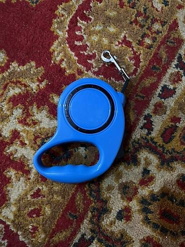 - Рулетка-поводок: компактный корпус, эргономичная закрытая рукоятка с упорами для пальцев, кнопка фиксации длины, прочный тросик/лента с металлическим карабином для быстрого крепления к ошейнику или шлейке. Корпус синего цвета.