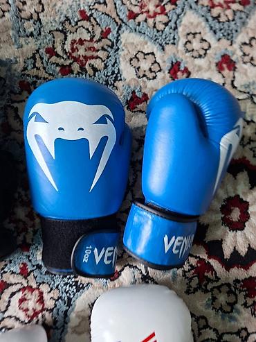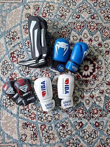 Набор подойдет для бокса, кикбоксинга, тайского бокса и ММА: перчатки для работы на ринге и снарядах, защита голени/стопы для ударной техники, лапы для отработки. Цвета: белый, синий, черный/белый. Бренды: Green Hill, Venum, RDX.