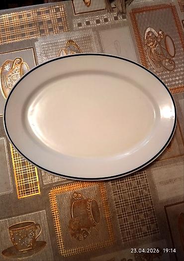 - Овальное блюдо/сервировочное блюдо из белой эмали с тонкой тёмной окантовкой — удобно для рыбы, запечённого мяса, гарниров.