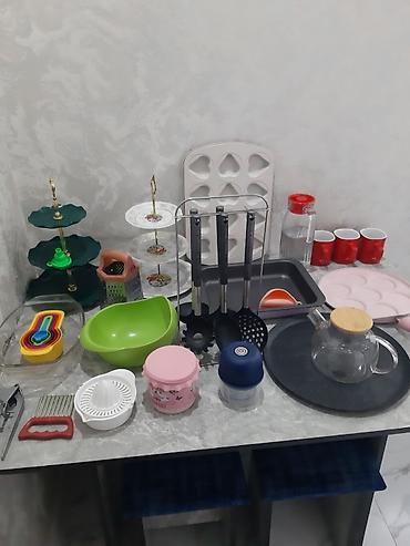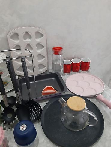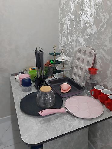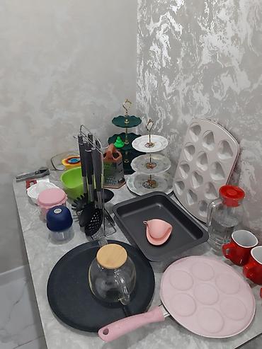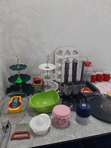 Набор кухонных принадлежностей и посуды для готовки и сервировки.
