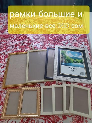 - Набор фоторамок разных размеров — большие и маленькие, несколько штук в светлых, черных и золотистых окантах. Подпись на фото: «рамки большие и маленькие все 950 сом».