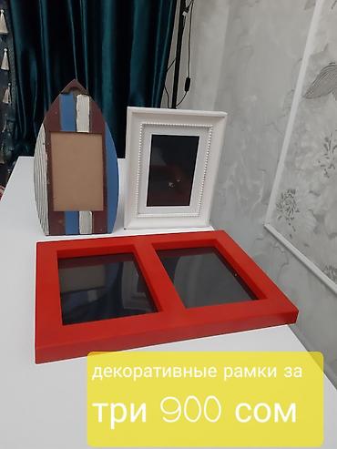 - Декоративные фоторамки — три штуки. В комплекте: белая классическая рамка с фигурным бортиком; оригинальная рамка в форме серф‑доски с полосами; двойная рамка ярко‑красного цвета с двумя окошками. На изображении указано: «декоративные рамки за три 900 сом».
