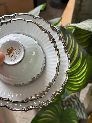 - Декор: фигурный край с металлическим (серебристым) ободком и барочным орнаментом