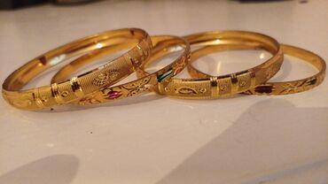 Комплект позволяет варьировать образ: один браслет с цветной эмалью добавляет акцент, два других — лаконично подчеркивают золотистый блеск. Отлично сочетаются с золотистыми серьгами и кольцами схожей фактуры.