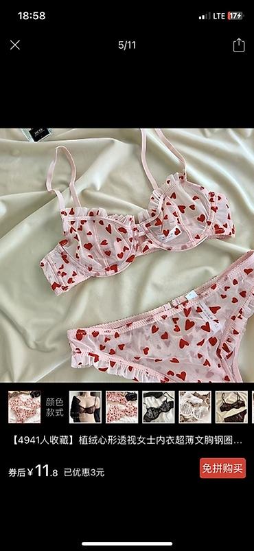 - Комплект белья из полупрозрачной сетки с красными сердечками: бюстгальтер на косточках с мягкими чашками, тонкие регулируемые бретели, рюши по краю; трусики в тон с оборками.