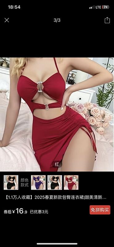 - Обтягивающее мини‑платье на бретелях с фигурными вырезами: декоративные кольца и «жемчужные» элементы спереди, сборка и завязки на бедре, длина выше колена. Доступны варианты цветов на фото (красный, черный, фиолетовый и др.).