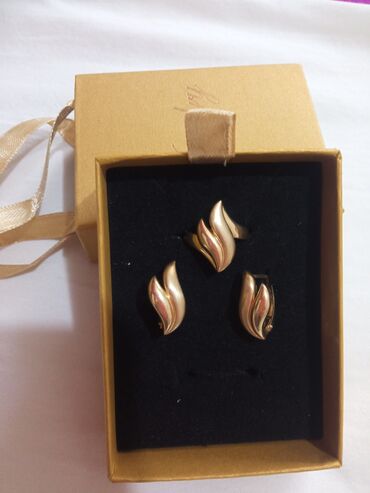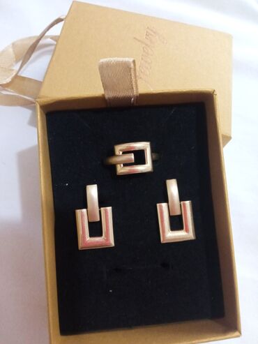 - Набор “Геометрия”: кольцо и серьги в едином дизайне с прямоугольными контурами и внутренним вырезом-квадратом. Тёплый оттенок золота, гладкая полированная поверхность. Серьги на удобных застёжках-клипсах; кольцо с широкой площадкой.