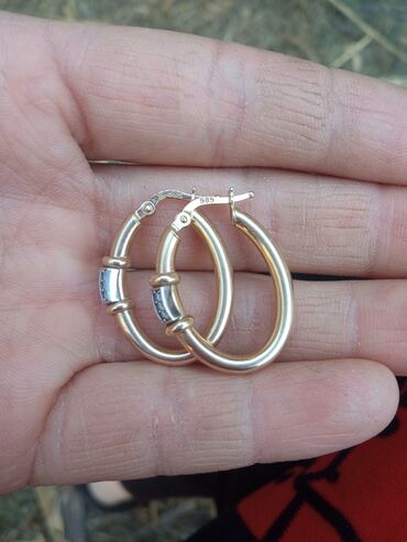 - Серьги-кольца: классические круглые кольца среднему размера с английским замком. На дужке и ободе есть клеймо «585». Декорированы вставками из белого золота/родирования и мелкой дорожкой камней на боковых перемычках. Универсальная модель на каждый день.
