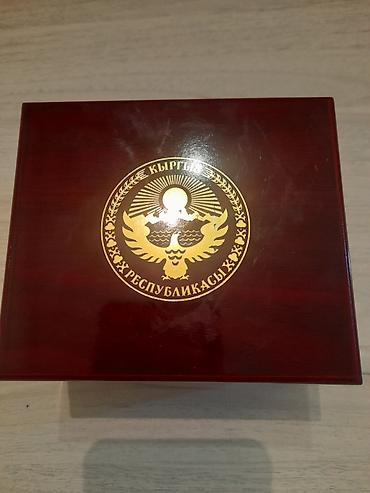 - Подарочная шкатулка из лакированного дерева с гербом Кыргызской Республики (тиснение золотом).