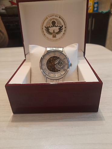 - Циферблат с римскими метками, декоративным открытым механизмом (скелетон) и эмблемой/надписью «Кыргызстан».